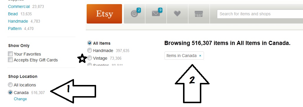 There are tons of great Canadian Etsy shops and you can find them in several ways. Doing a search may be a bit strange---if you have your local preferences on. For instance, if you live in the States, or even in Canada searching for vintage will usually bring your local preferences up first (You can see this search in the left hand size of your screen, refer to image #1 above and it normally auto populates and defaults to your local area.) Meaning if you live in Surrey, Canada,  you may not see Montreal's shops right away. Or if you live in York, Pennsylvania USA you will see your local shops first, and not even realizing you are missing out on other searches all over the place. This all depends on how your searches are set up and you will want to broaden the search you can uncheck your local location and type in "Canada" to get all the great Etsy shops and items (#1).  Then verify this by making sure the top of your screen has "Items in Canada" (#2 above).  This process will then allow you to check off vintage, handmade, or supplies.  You can apply this same prinicpal to whatever country it is you wish to shop.